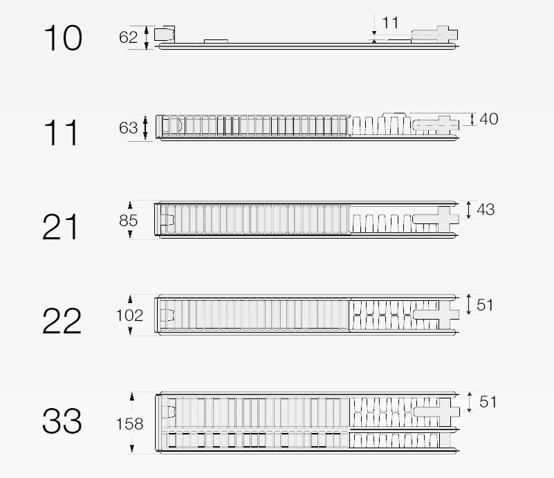 - Jednodeskové s lamelou (C11) – lamela za deskou zvyšuje účinnost přenosem tepla do vzduchu